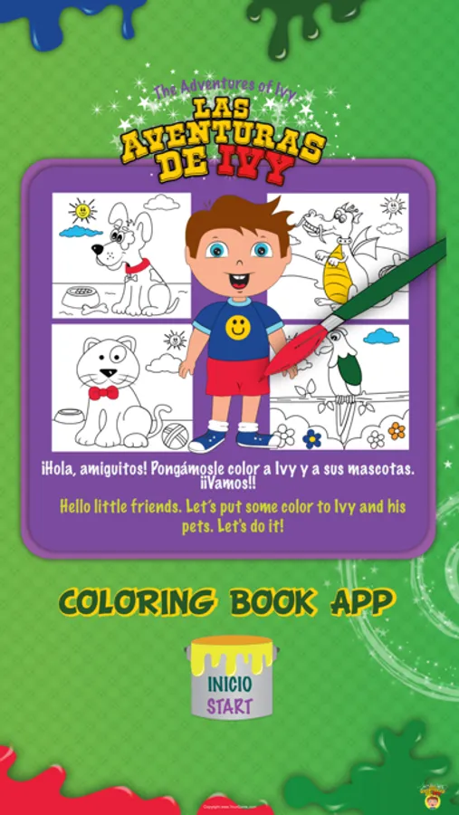 DEAR FRIENDS! Meet Ivy, the time adventurer, and his pets. Have fun giving them color. This coloring application will help you develop creativity in early or formative ages and free expression through art.