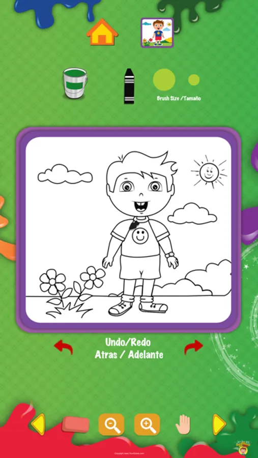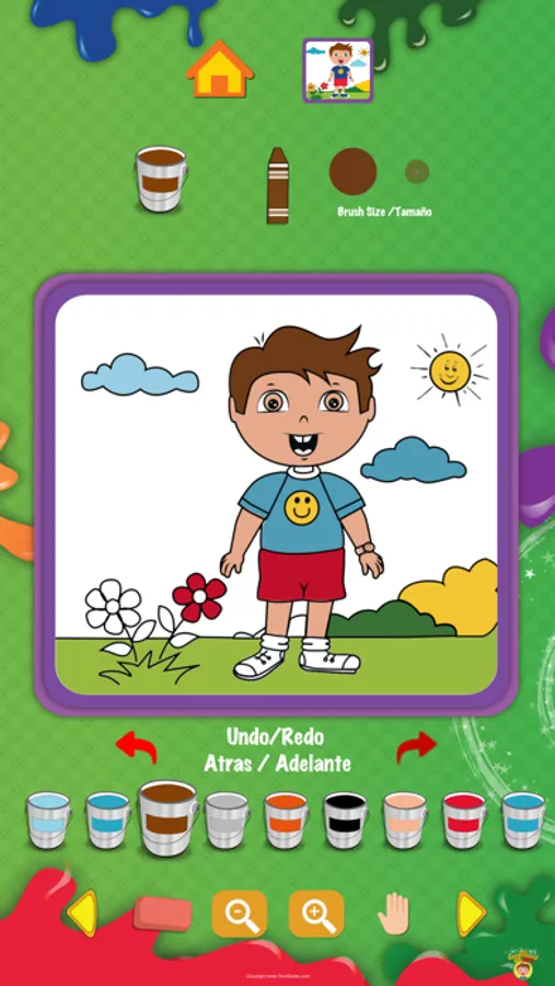 Press the start button and start coloring. Touch the screen and choose the paintbrush, color or paint bucket and have fun.