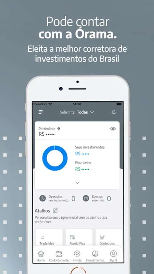 Na Home, por exemplo, é possível visualizar informações que são importantes para você. Logo após o login efetuado, você já encontra: o valor bruto do patrimônio, operações em andamento, o calendário com os próximos eventos, e ofertas de investimentos. Além disso, utilizamos a tecnologia para disponibilizar serviços financeiros, de forma eficiente, simples e ágil. Confira!