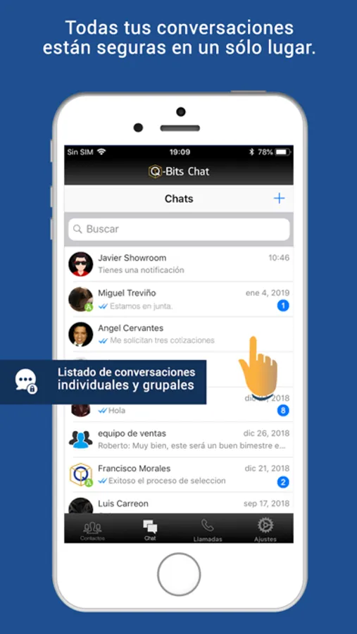 • CHAT GRUPALES: Chatea con tus contactos en conversaciones de grupo para facilitar la comunicación con tus compañeros de trabajo, amigos y familiares.