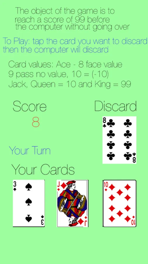 Great game to pass the time. Take turns against the game to see who can get to the score of 99 and not go over.
