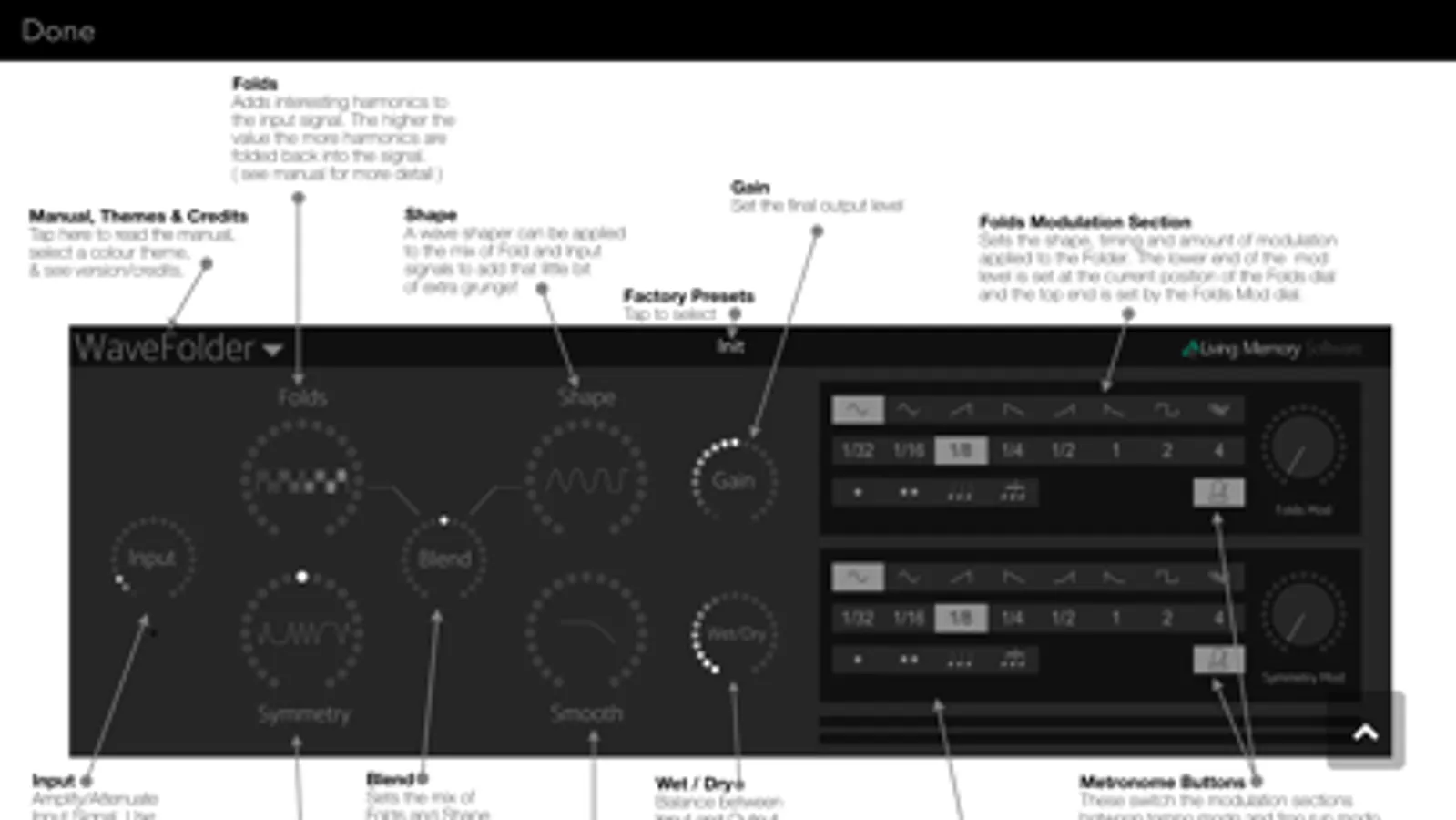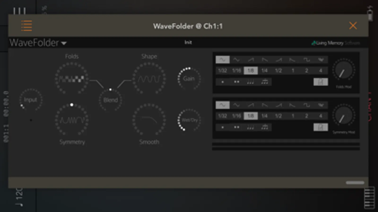 WaveFolder lets you set the folding thresholds and modulate the folding amount and symmetry with tempo based or free running modulators. WaveFolder also includes a wave shaper to add even more interest.
