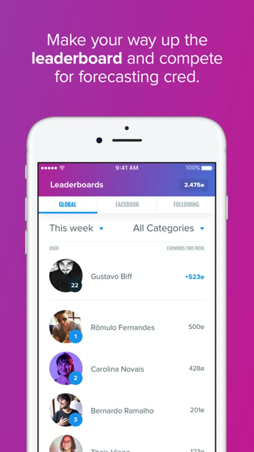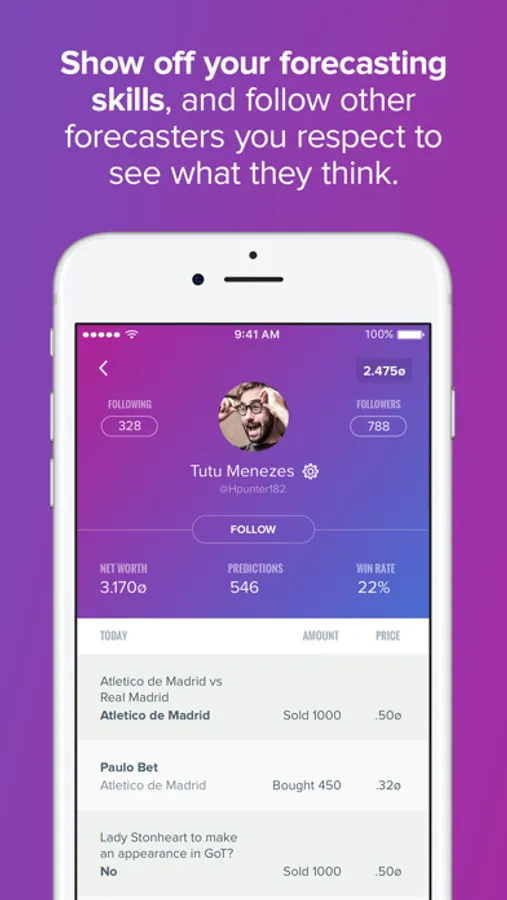 Futuur allows forecasters to improve their prediction skills learning from real-world feedback, and to show off their abilities to the world. They can follow and engage with other forecasters, and compete on the leaderboards for forecasting cred and bragging rights.