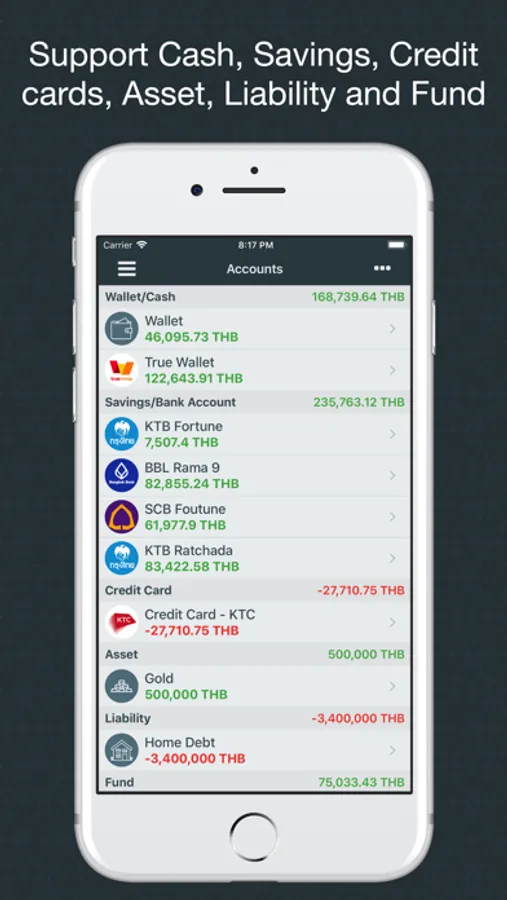 - Track your cash, savings, credit cards, asset, liabilities, and fund