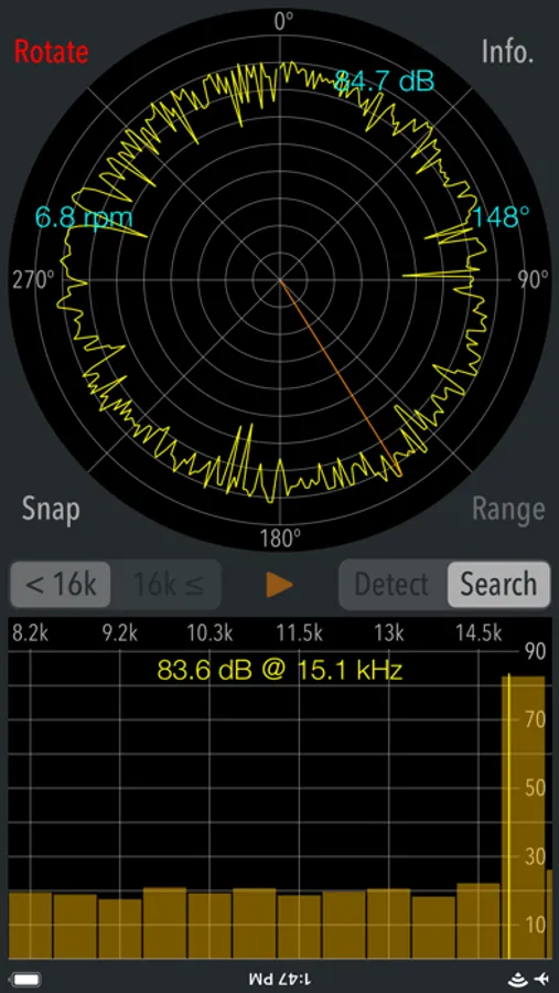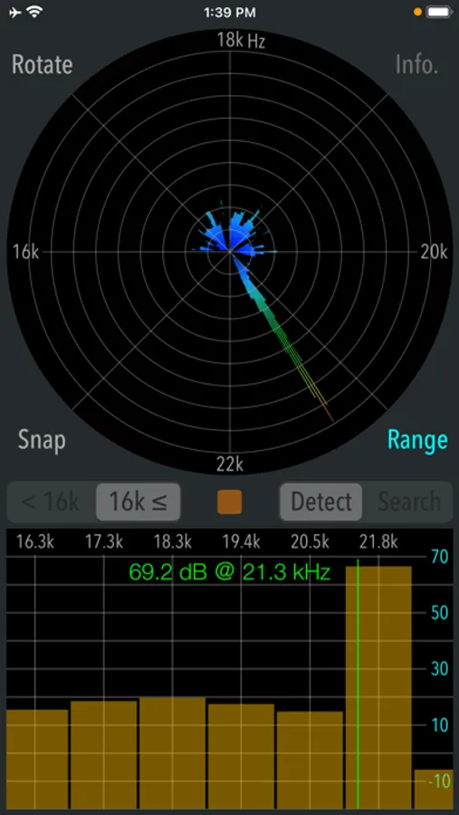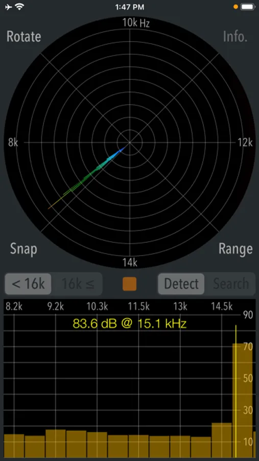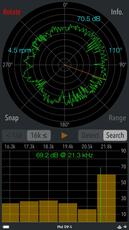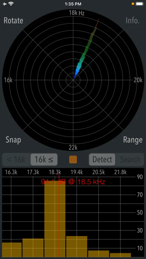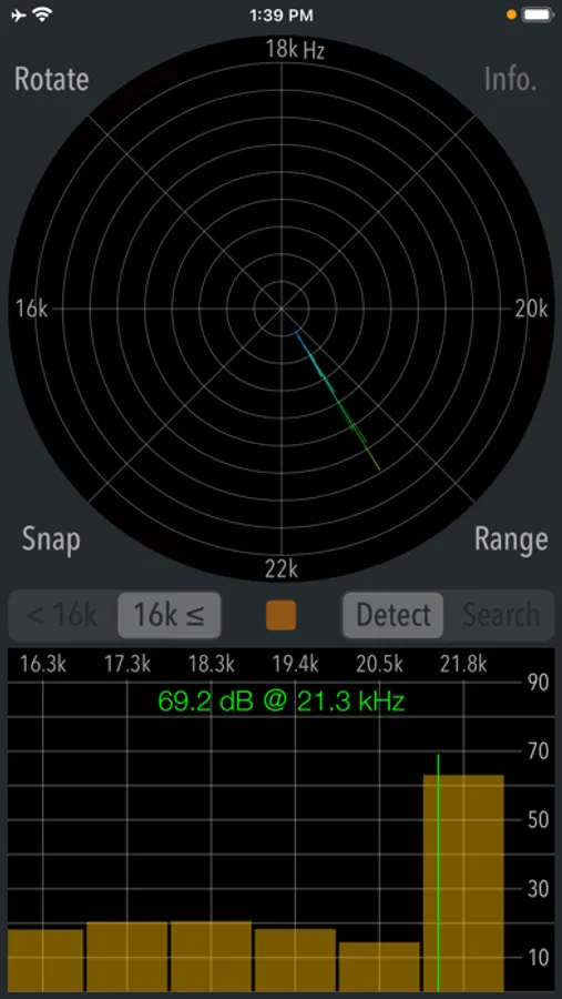 This app has two operation modes, "Detection" and "Search". Detection mode can check if there are high frequency and ultrasonic sounds that you can not hear. Search mode can find the direction of high-frequency sound source. It can only be used when it has found the peak frequency in Detection mode.
