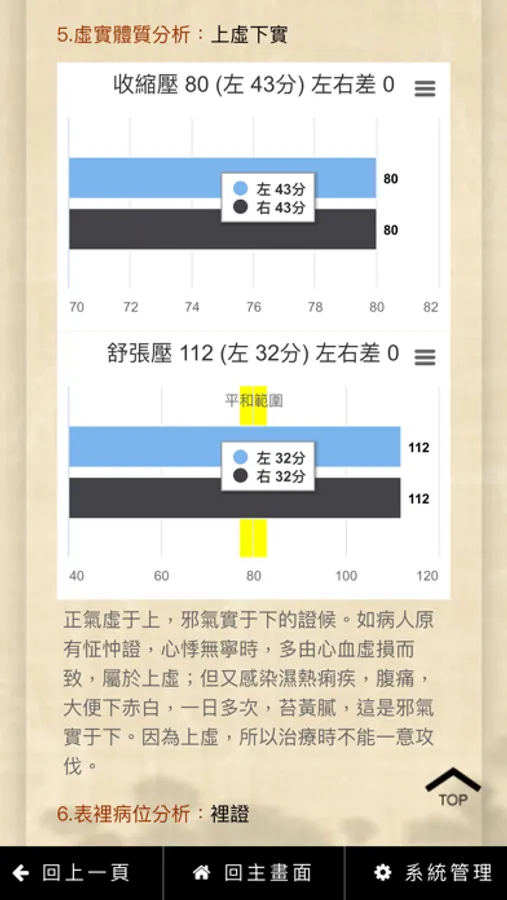 量測人員能在一分鐘之內,檢測出機體氣血盛衰之生命能量數值、體質現況等級、中醫九大體質分析、寒熱體質分析、虛實體質分析、表裡證位分析、陰陽體質分析、經絡調理建議及最近受測者五次複檢數據,供專業人員持續監控健康管理,憑據正確因證施治。