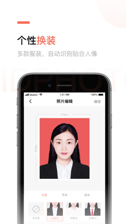 拍摄一旦检测通过,一键生成证件照。智能换装,自动贴合人像,多套衣服模版可选。