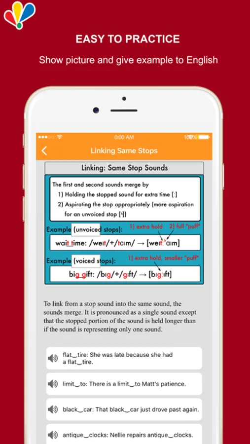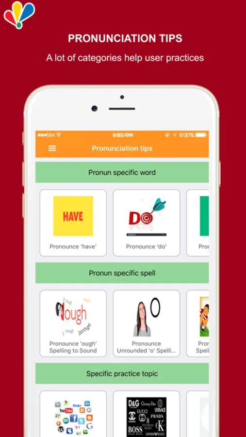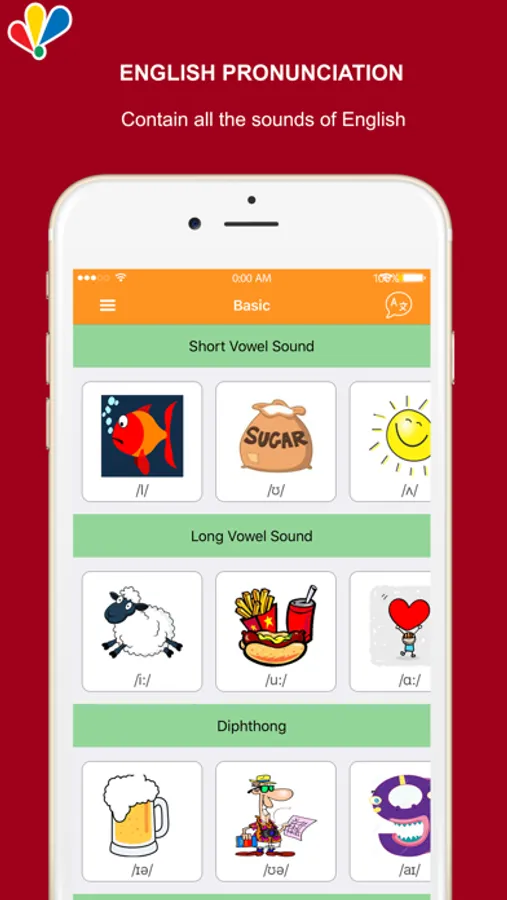 * Various lessons: step by step English pronunciation lessons with basic level (vowel sounds, diphthong sounds and consonant sounds), advanced level (linking word, stress and intonation) and many interesting pronunciation tips.
