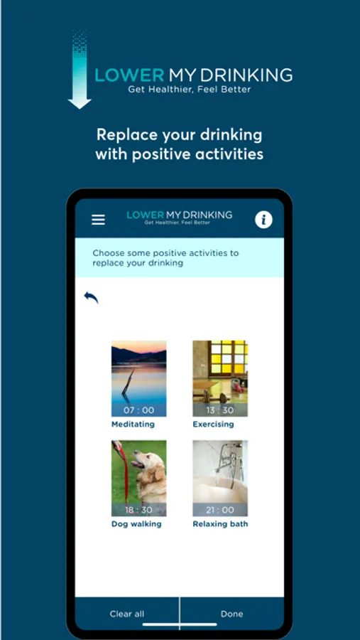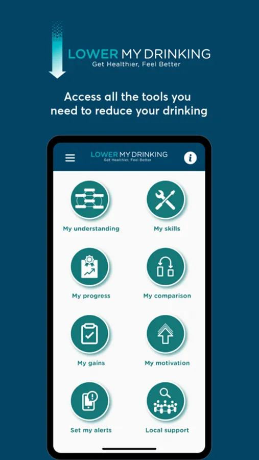 Lower My Drinking will guide you to set your drinking goal. Then it will help you achieve this by guiding you to: