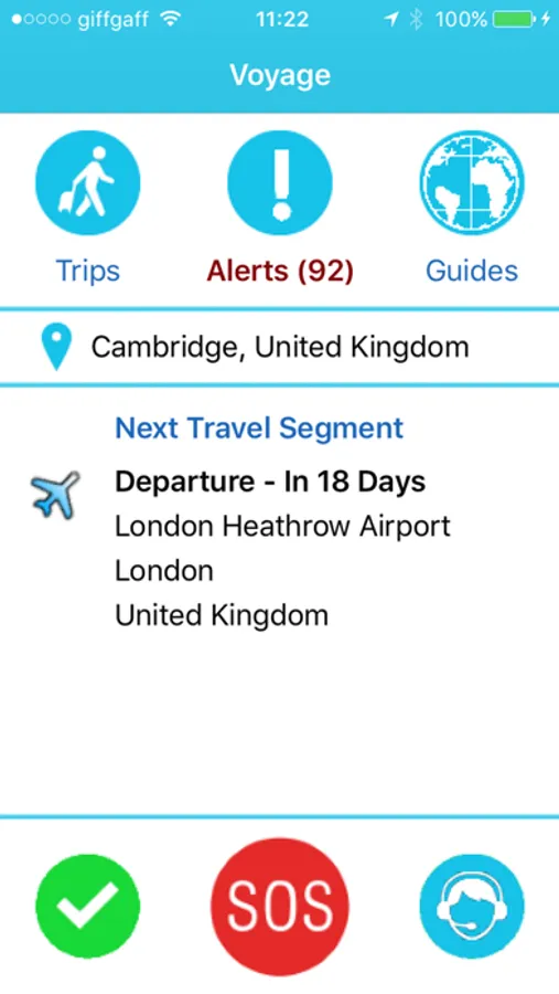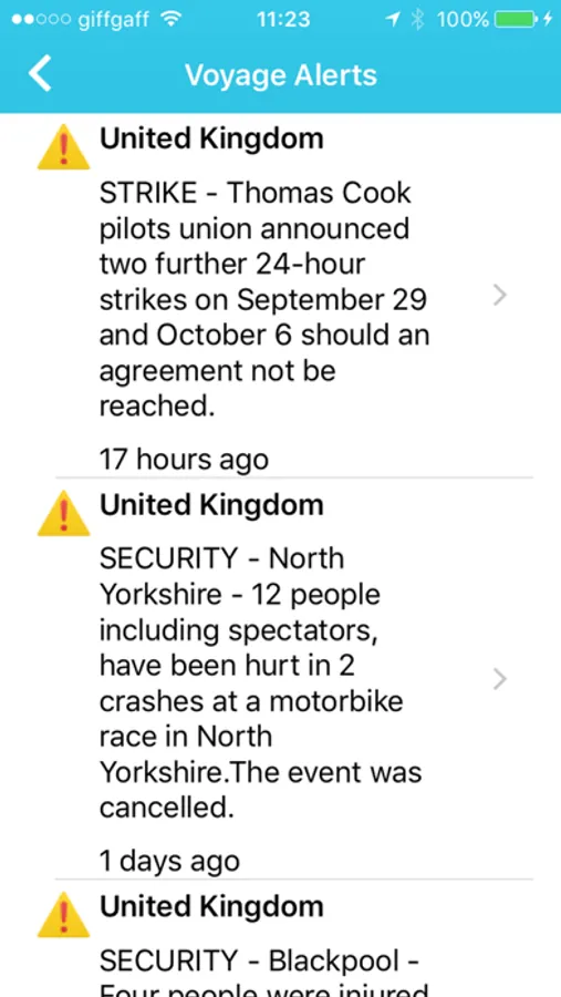 Voyage app downloads the latest alerts for your destination, giving you current security updates that might affect you. On the home screen you can easily see how many new alerts have come in since you last read them.