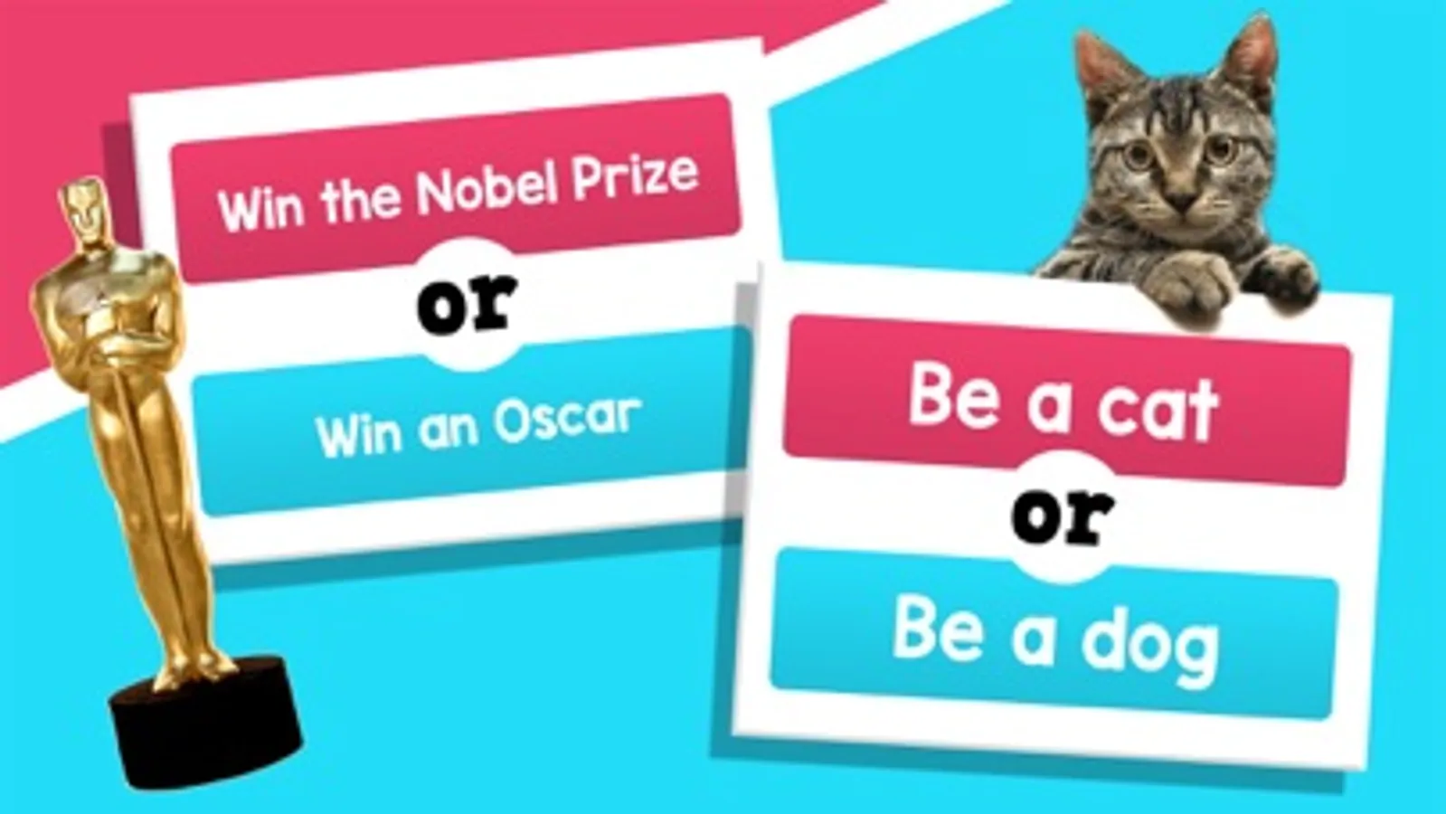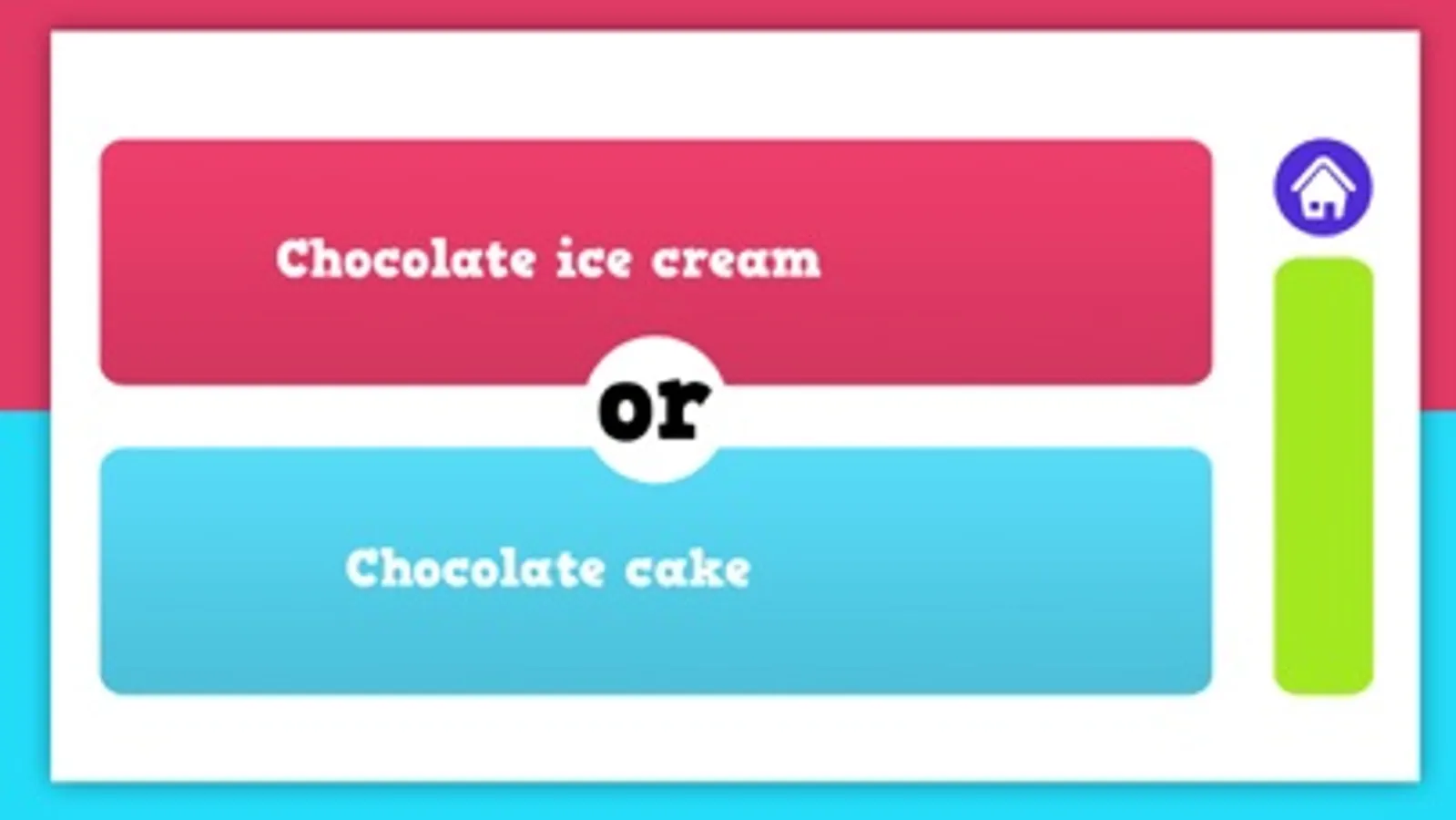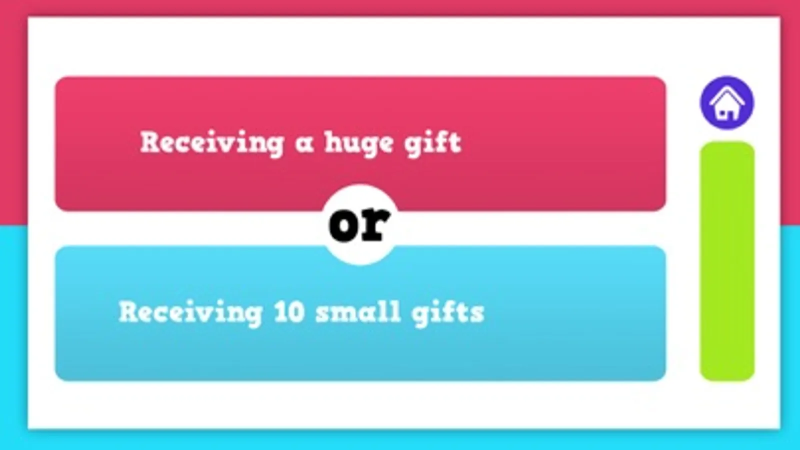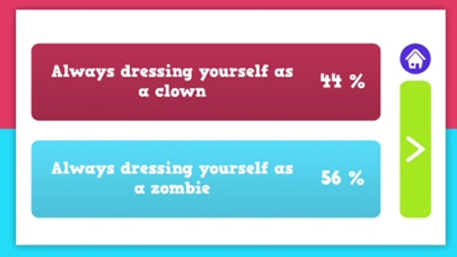 This quiz game has questions involving two impossible choices in which the player must answer with one of the choices, even if neither of them really appeal to the person. One has to choose only a situation out of two. The questions can be funny and outrageous, serious, or mundane. You can find hundreads of questions but only two options, either yes or no, right or wrong, agree or disagree. Find more than 300 questions in English and Spanish! After each answer you can see the percentage of the responds by other users!