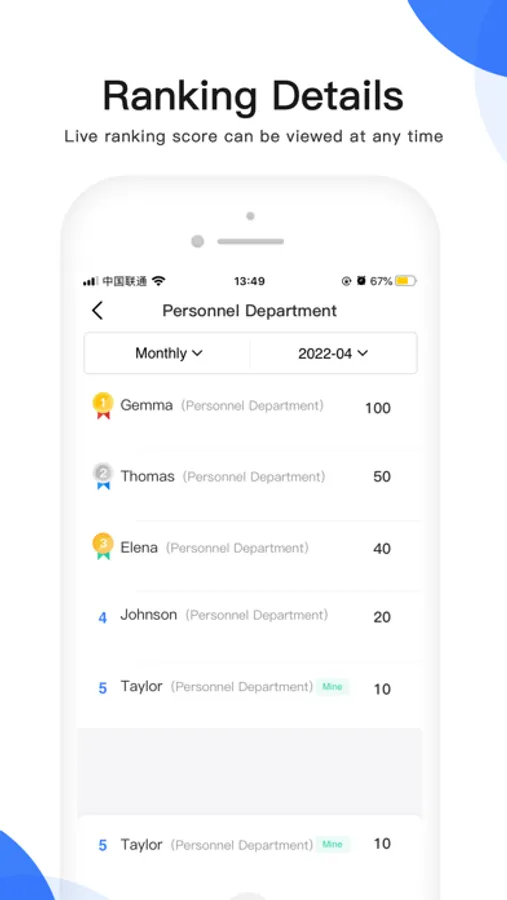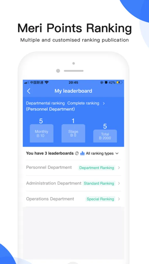 【Merit Point Ranking】 Customized group ranking display module. The ranking is based on dynamic disclosures with live score data, rankings are updated instantly. Quantitative assessment on merit point big data helps to provide constructive viewpoint during appraisal