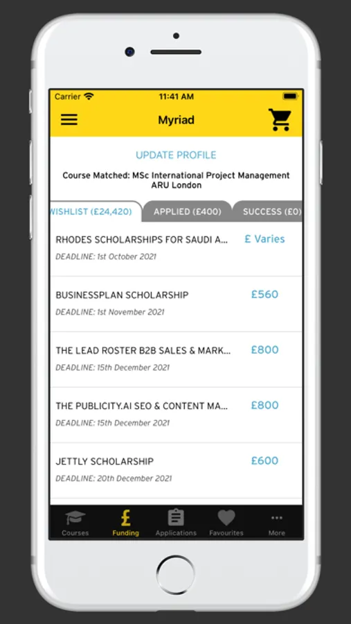 Our personalised scholarship matching service gives you a tailor-made list of scholarships that you are eligible to apply for, providing easy access to grants and scholarships applicable to your course. You can shortlist funding opportunities, apply to the awarding bodies directly and even get notifications so you never miss a scholarship deadline.