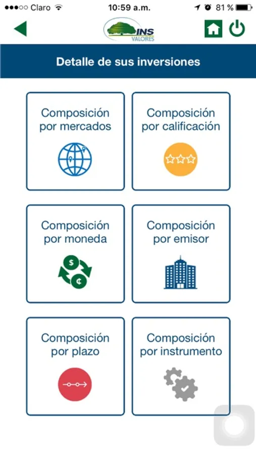 - Sus inversiones mediante un resumen de su estado de cuenta. También podrá consultar la composición de sus inversiones por mercados, calificación de riesgo, moneda, emisor, plazo e instrumento y dentro de cada uno podrá obtener el porcentaje de distribución respectivo.
