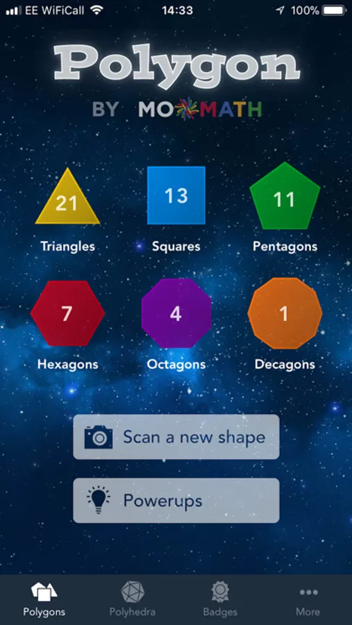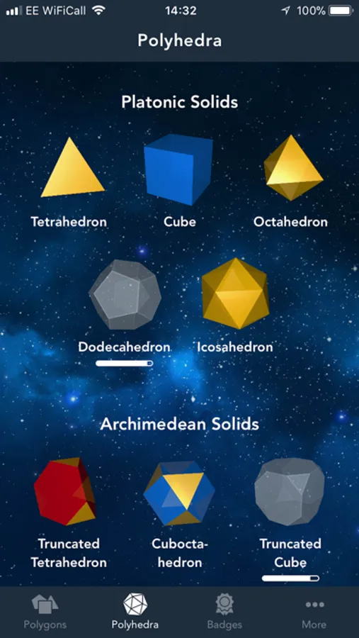Polygon allows users to discover polygons hidden in museums or science centers, and use them to construct Platonic and Archimedean solids. Scan polyhedra with your phone’s camera, answer mathematical questions to get powerups with additional shapes, and view the finished solids in Augmented Reality.