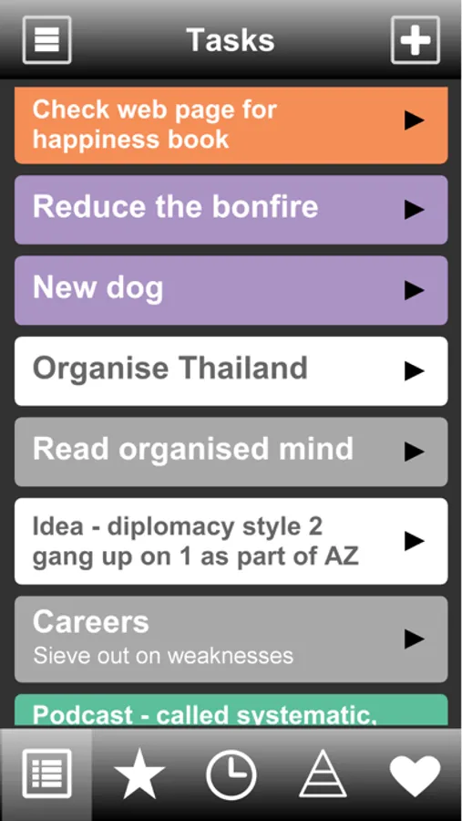 I made this app because none of the current apps did what I wanted. Very quick task entry, press one button to see the most urgent ones, another to see the most important. And if you have only a short time available, or want to do something fun, buttons for that. Then there's my magic formula which tells you what to do first, based on urgency importance size and fun factor!