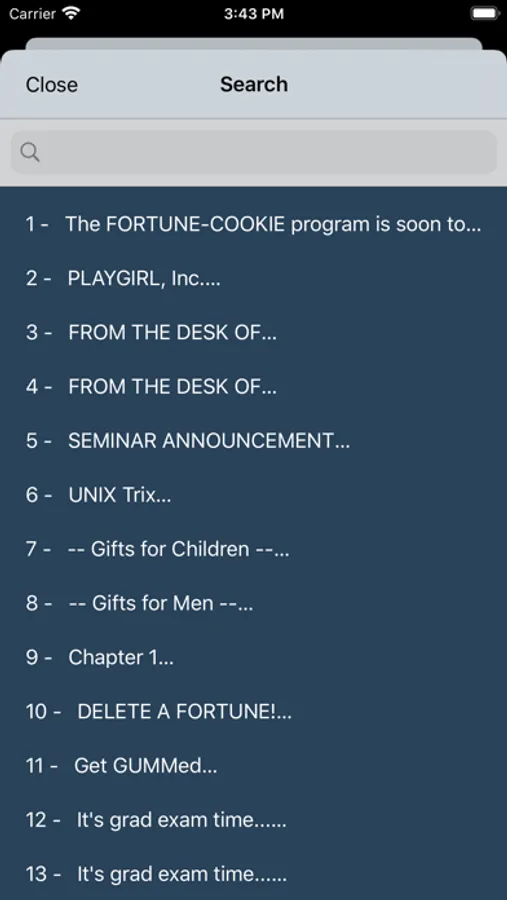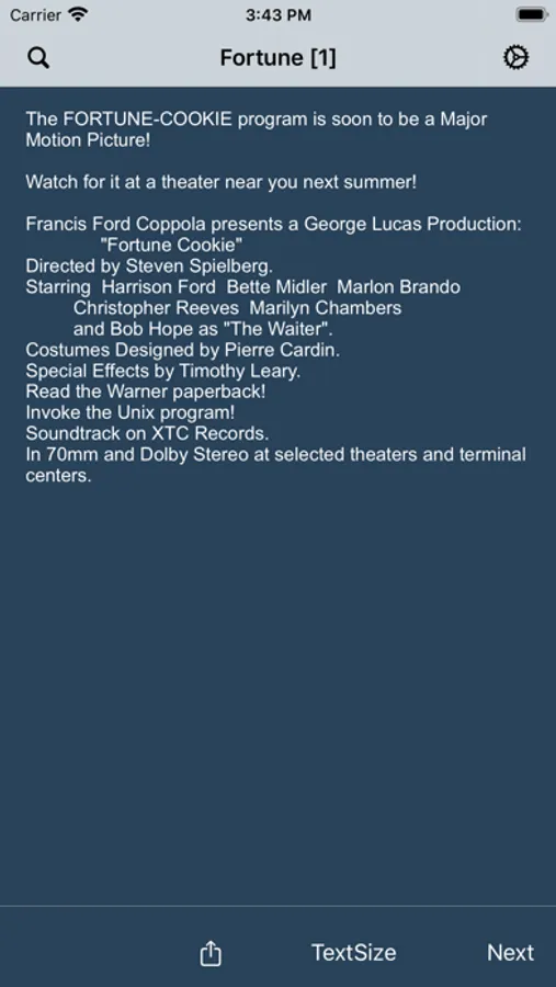 My Unix Fortune is a simple app that displays a random or searchable message from a database of 17,446 unique quotations that first appeared in early versions of Unix. Fortunes are bundled with a collection of themed files, containing sayings like those found on fortune cookies (hence the name), quotations from famous people, jokes, or poetry. One of my favorite is the definition of gyroscope.