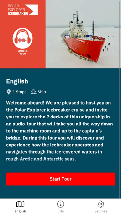 Tour includes an introduction and 7 stations on the icebreaker. Available in 15 languages: English, Spanish, French, German, Italian, Portuguese, Turkish, Russian, Hebrew, Malay, Indonesian, Thai, Japanese, Mandarin, Cantonese.