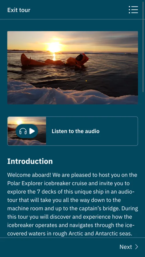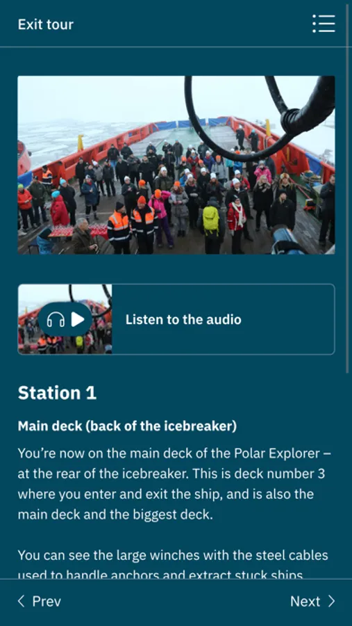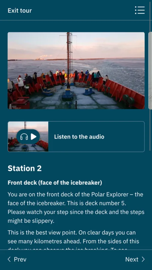 Polar Explorer Icebreaker audio tour invites passenger on board to experience “7 decks tour” with their own personal audio guide using own mobile phone. Learn how icebreaker works, visit all 7 decks of the ship, read or listen to the explanation. You do not need an internet connection while touring.