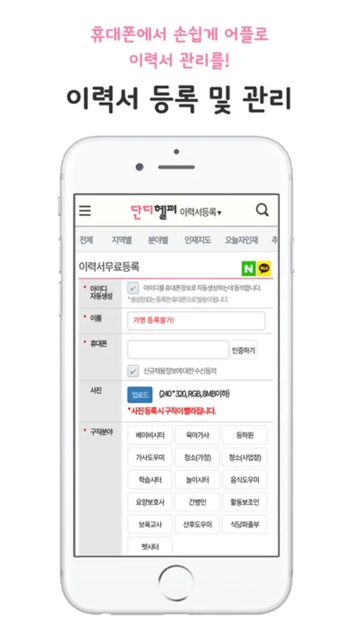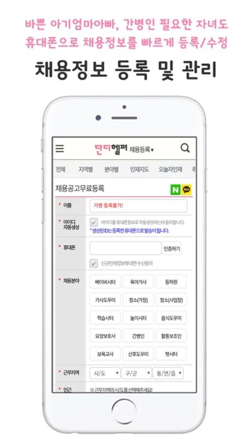채용정보등록과 동시에 도우미분의 휴대폰으로 요약채용정보가 통지되어