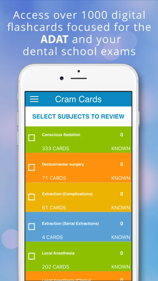 ADAT CRAM CARDS effectively and efficiently helps you study less, score higher both on your Dental School Exams and helping you pass your Advanced Dental Admission Test (ADAT). Because we understand you are always on the go, these digital flashcards help you study right from your iPhone or iPad (without having to lug around heavy Dental Deck flashcards). These flashcards go over commonly tested facts and concepts for both your dental school exams and for the ADAT Exam by enabling you to save precious study time. Also, why pay hundreds of dollars for dental board flashcards when you get it right here for only a fraction and save! Double win for you! Flashcards are scientifically proven to be one of the best ways to learn. Our engineered system teaches you and makes memorizing easier – saves time, effort and frustration. ADAT CRAM CARDS will push the cards you need to learn harder than the rest, making sure you learn what you need. Easy to use! And always in your reach! You can use ADAT CRAM CARDS in your free time, waiting for the bus, on the subway, during lunch or wherever you want. ADAT CRAM CARDS lets you make the most of all those short periods of time that you have every day. All your ADAT FlashCards, right at your fingertips. This is why ADAT CRAM CARDS is voted the best way to prep for the Advanced Dental Admission Test, both efficiently, effectively and affordably on your iPhone or iPad. Study Smarter, Score Higher on your ADAT Exam and gain admission into top dental residency programs!