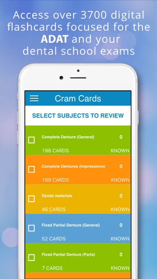 ADAT CRAM CARDS effectively and efficiently helps you study less, score higher both on your Dental School Exams and helping you pass your Advanced Dental Admission Test (ADAT). Because we understand you are always on the go, these digital flashcards help you study right from your iPhone or iPad (without having to lug around heavy Dental Deck flashcards). These flashcards go over commonly tested facts and concepts for both your dental school exams and for the ADAT Exam by enabling you to save precious study time. Also, why pay hundreds of dollars for dental board flashcards when you get it right here for only a fraction and save! Double win for you! Flashcards are scientifically proven to be one of the best ways to learn. Our engineered system teaches you and makes memorizing easier – saves time, effort and frustration. ADAT CRAM CARDS will push the cards you need to learn harder than the rest, making sure you learn what you need. Easy to use! And always in your reach! You can use ADAT CRAM CARDS in your free time, waiting for the bus, on the subway, during lunch or wherever you want. ADAT CRAM CARDS lets you make the most of all those short periods of time that you have every day. All your ADAT FlashCards, right at your fingertips. This is why ADAT CRAM CARDS is voted the best way to prep for the Advanced Dental Admission Test, both efficiently, effectively and affordably on your iPhone or iPad. Study Smarter, Score Higher on your ADAT Exam and gain admission into top dental residency programs!