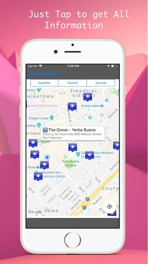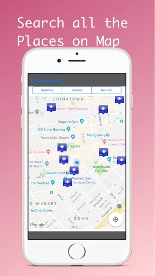 1) Places are displayed in user friendly map views (hybrid,standard and satellite)
