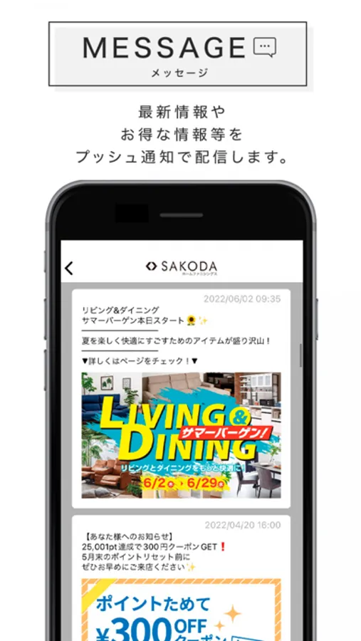 お得な情報をプッシュ通知でお知らせします。アプリの初回起動時にプッシュ通知を「ON」に設定するようお願いします。なお、オン・オフの設定は後から変更もできます。