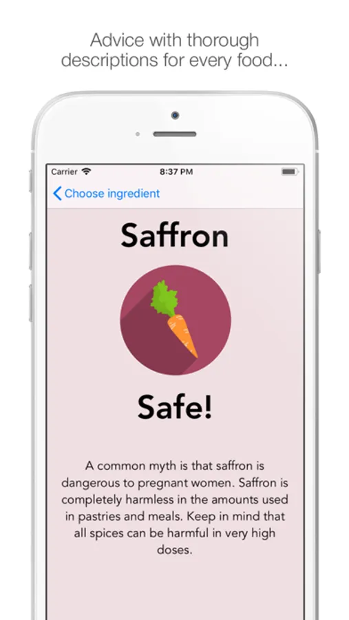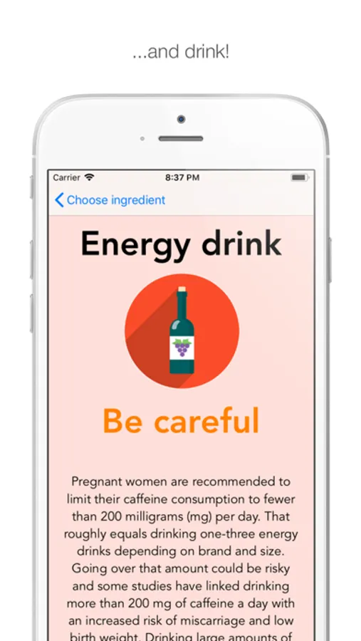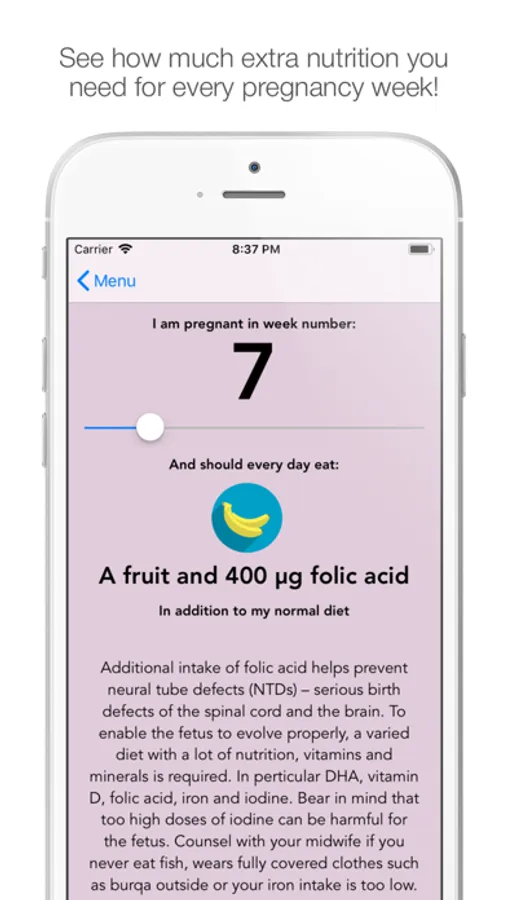 The app also contains information about how much extra nutrition you should eat depending on current pregnancy week!