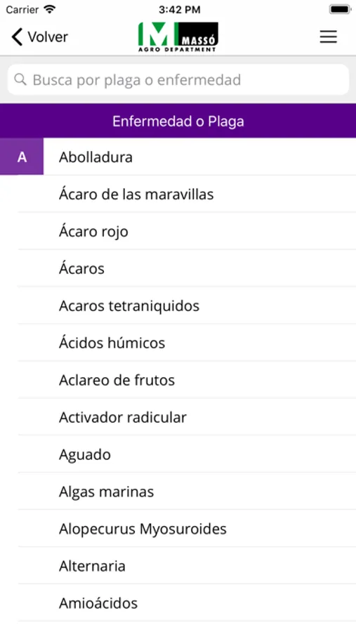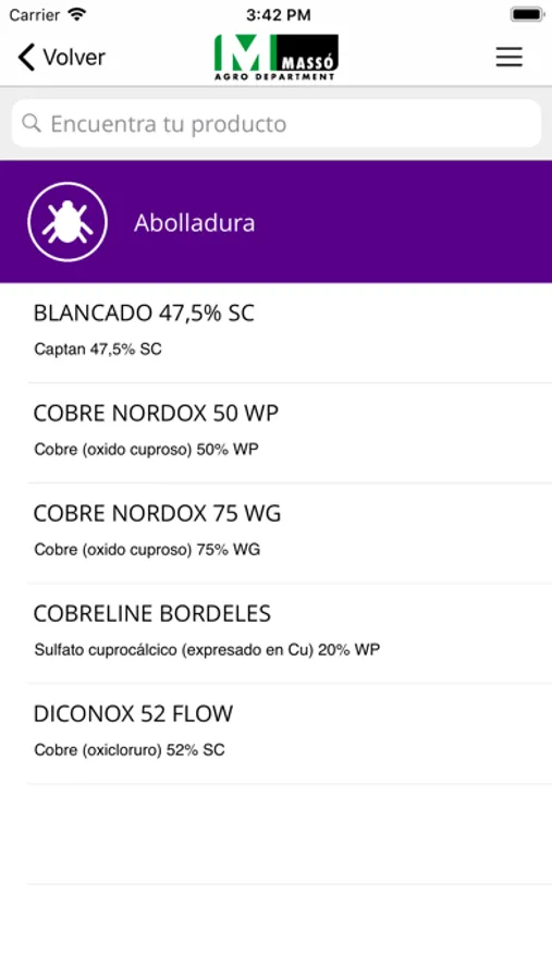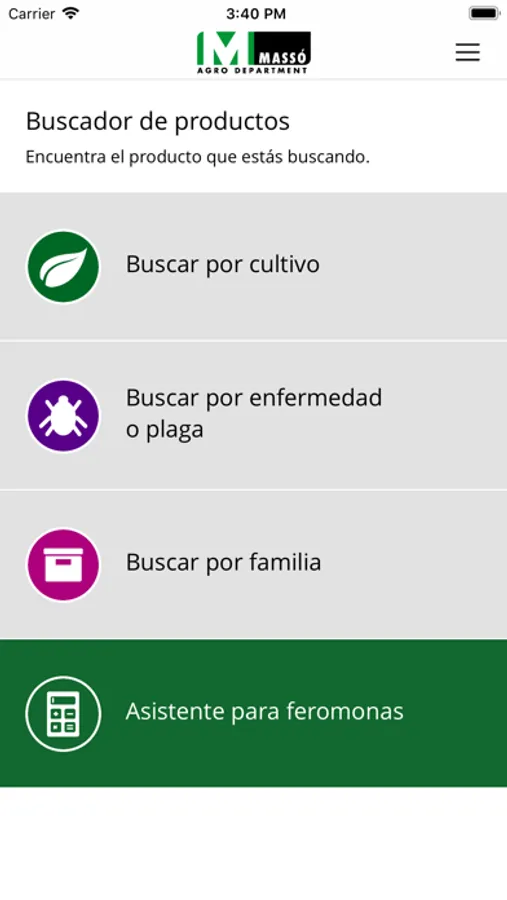 Massó Agro es la solución definitiva para obtener toda la información que necesitas referente a productos fitosanitarios. Ponemos a tu disposición toda nuestra experiencia y te ofrecemos una aplicación en la que podrás encontrar un extenso listado de productos para la agricultura por diferentes categorías: por cultivo, enfermedad o plaga y por familia.