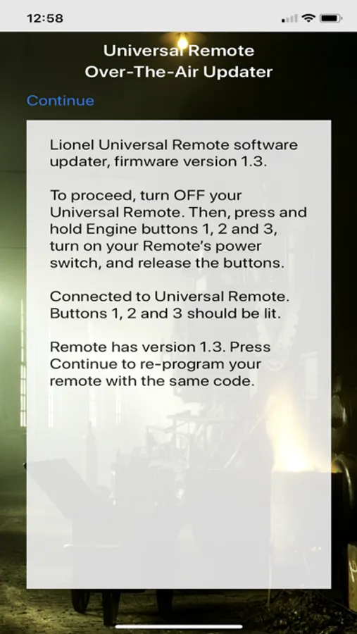 Use this free app to update your Lionel LionChief LC/LC+ Universal Remote Controller (6-83071) to version 1.3. This update enhances remote functionality for operation with all LionChief and LionChief+ products.