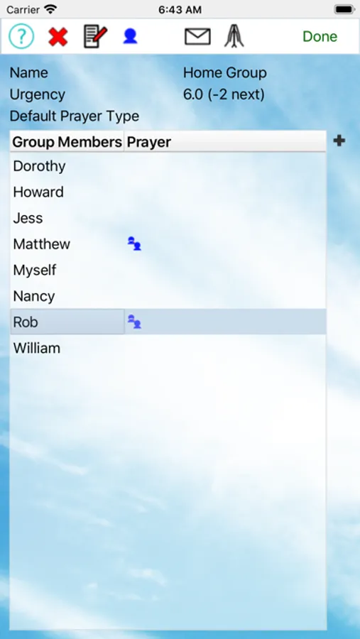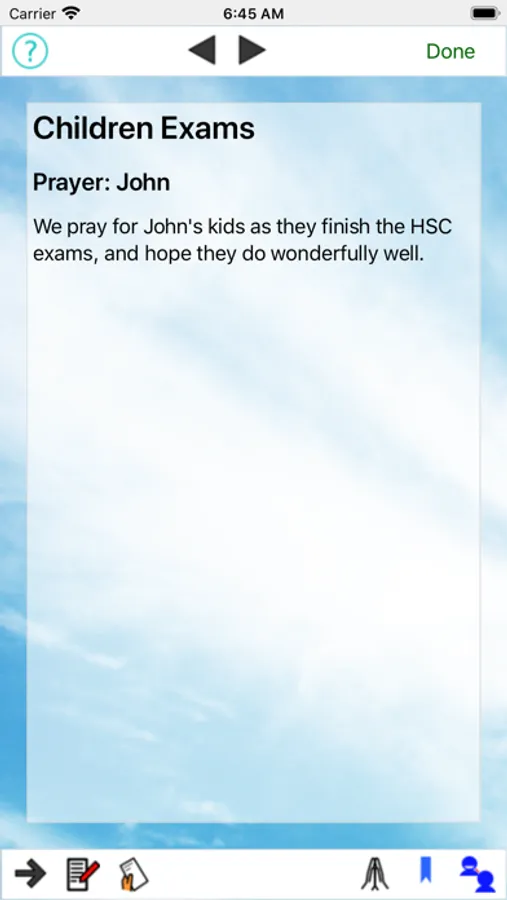- Group prayer mode lets you quickly jot prayer points from each person in a group, then either pray those points or mark them off, then re-visit the points next time you all meet.