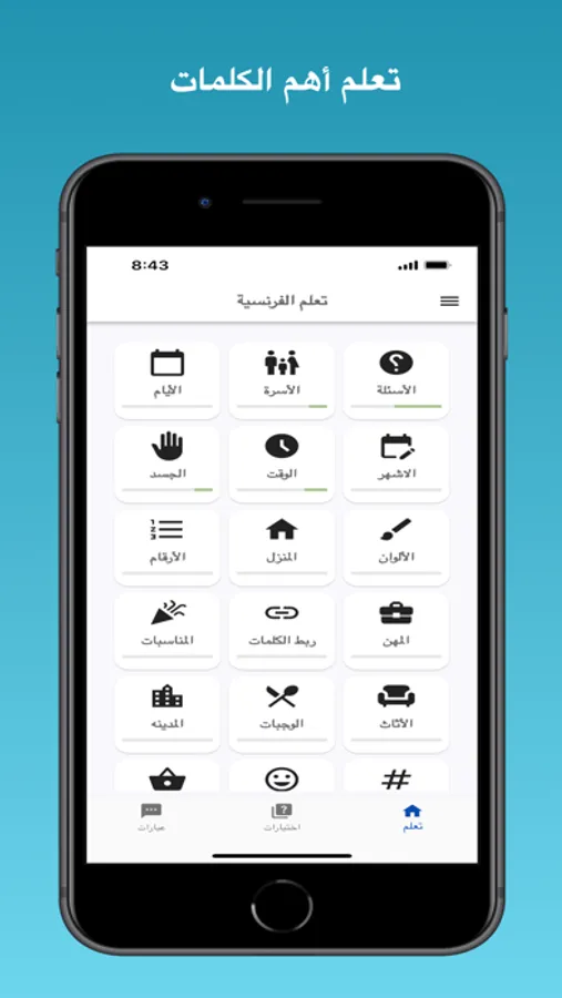 تعلم اللغة الفرنسية تطبيق لاختبار و لتعلم اللغة الفرنسية في أقصر وقت بالتمكن من أهم الكلمات المستعملة في الحياة اليومية