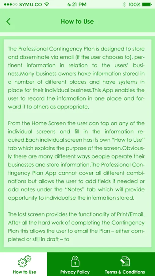 Planning for our death, a serious accident or illness is not something most of us want to think about. Approximatey 60% of people do not have a Will. This app is not a Will but recognizes many people in small business don’t have any plan for their business if a catastrophe occurs. Contingency Plan - Professional is a business based application to assist people with the recording and distribution of their business information in the event that they become unable to continue functioning within their business.
