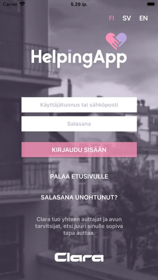 The login requires credentials, which the volunteer can get from the volunteering organization. The organization needs to have an agreement with Clara Finland Oy for the Clara service.