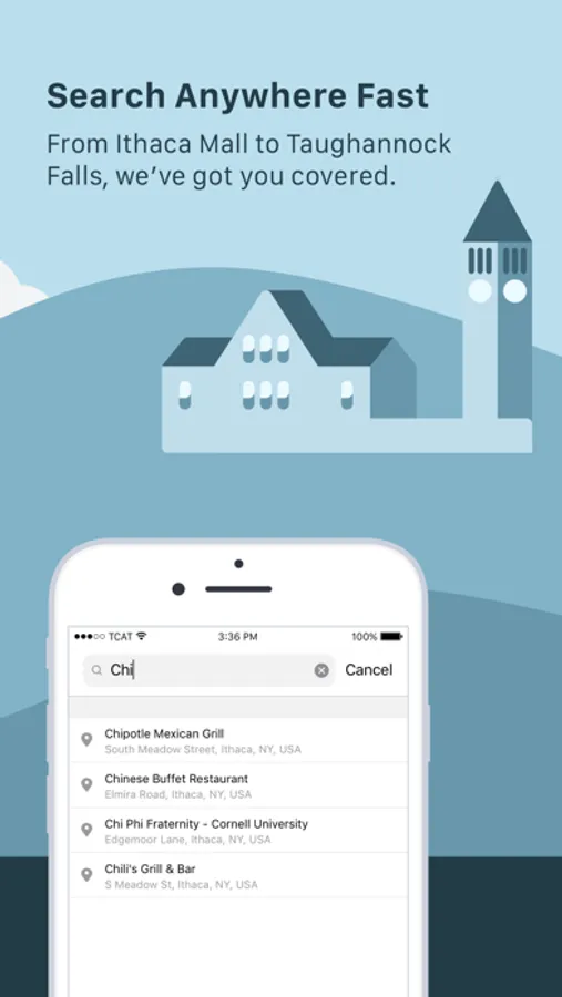Ithaca Transit integrates with Google Places to allow you to search bus routes to any destination in the country. Search up Chipotle or Waffle Frolic and let the app take care of the rest, including accurate walking directions!