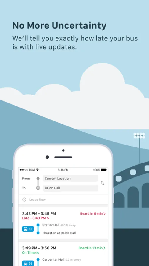 Want to know is the bus is running late (again) or where it’s even at? We’ve got you covered. View actual bus locations on the map and see expected delay times, all in one easy-to-use interface. We use the latest dynamic transit data directly from TCAT to ensure the most up-to-date information.