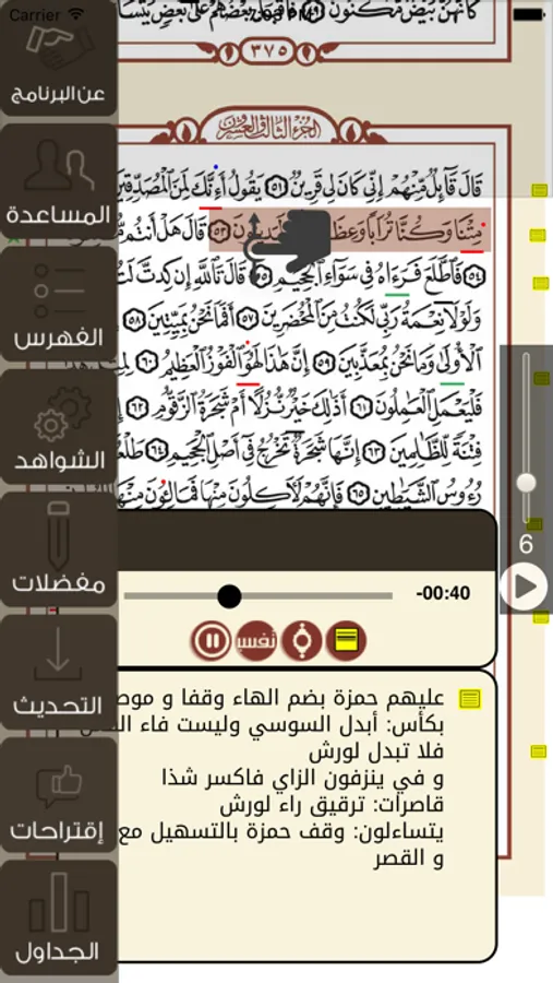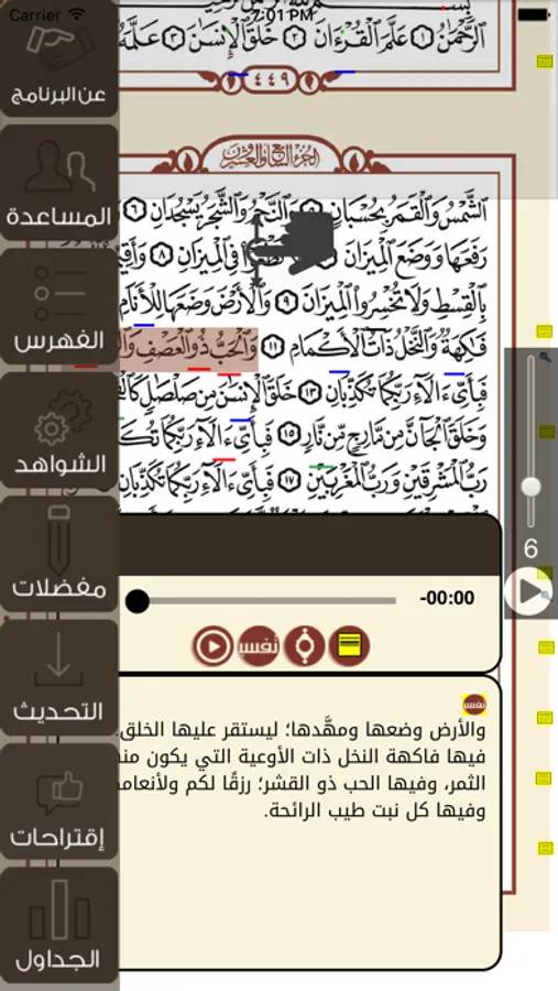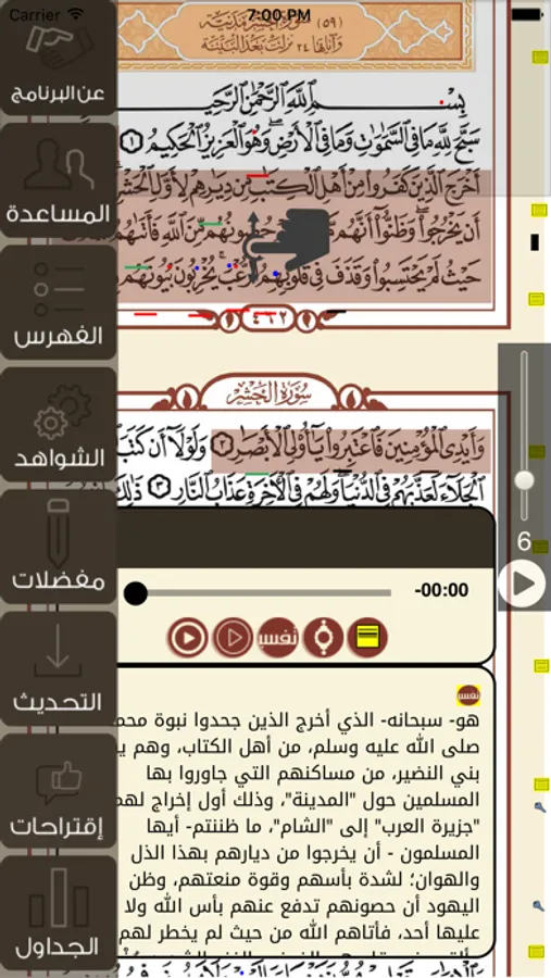 إمكانية إظهار التفسير أو نص الآية أو الادلة أثناء وقت التلاوة أو التقدمة للآية المختارة