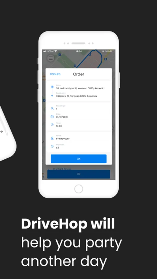 The on-demand DriveHop service is an app to order a driver who will drive the drunk driver back home in his own car. With an interactive interface to place an order, you can add specific comments about the ride, see the driver's name or call him, and rate after the order is complete. The online payment system makes it easy to proceed with payment without any cash. The trusted drivers will take you and your care safely back home.