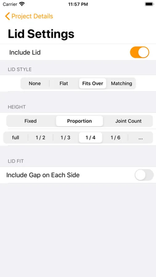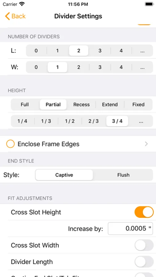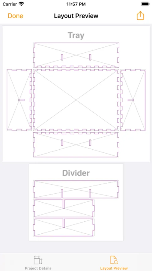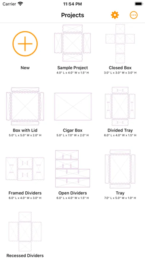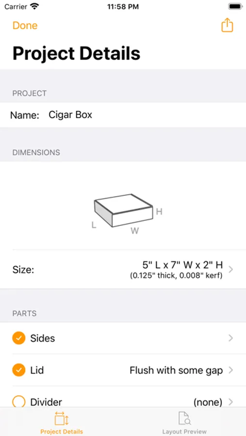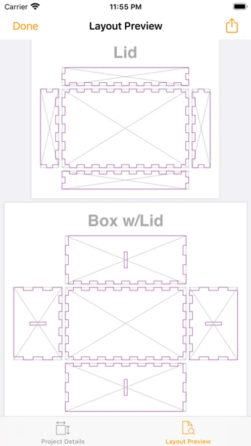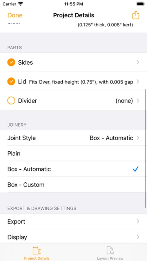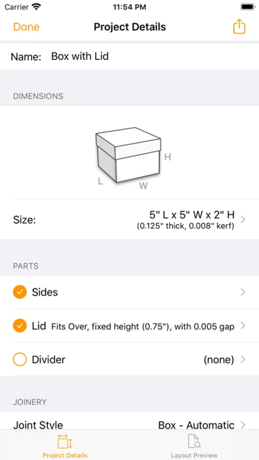 Boxes can be fully enclosed with 6 sides, or have one or more sides removed for open boxes, frames or other combinations. Lids can be flat or fit over with adjustable depth and fit. Grid Dividers can be added to boxes, with or without frames around the edges. Joints can be plain or smooth, or box joints that are automatic or specified by count. Material thickness and kerf can be configured for a precise fit.