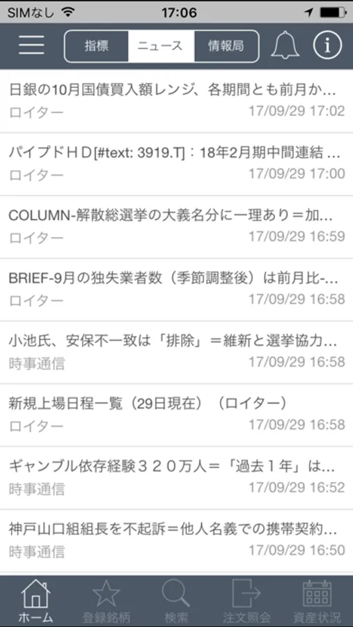 QUICKと時事通信社の最新ニュースをご覧いただけます。一覧から記事をタップすると記事の詳細をご覧いただけます。配信数はPC版取引ツールと同等となります。