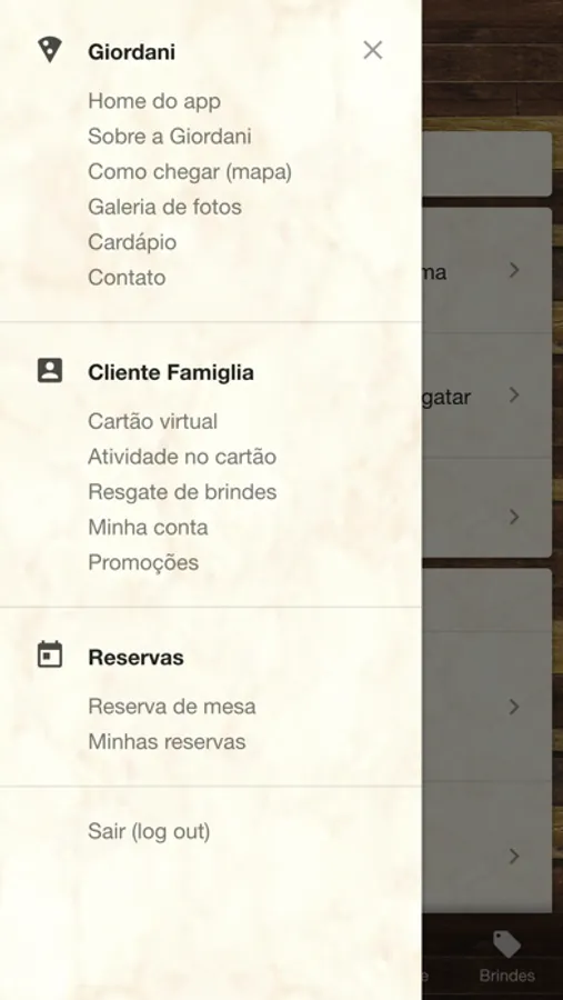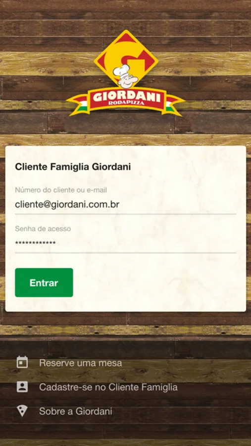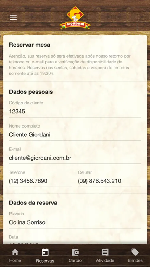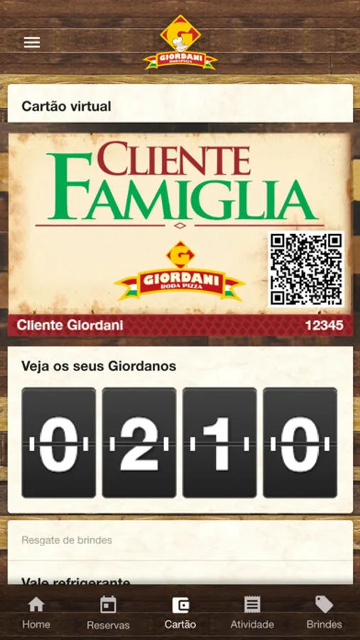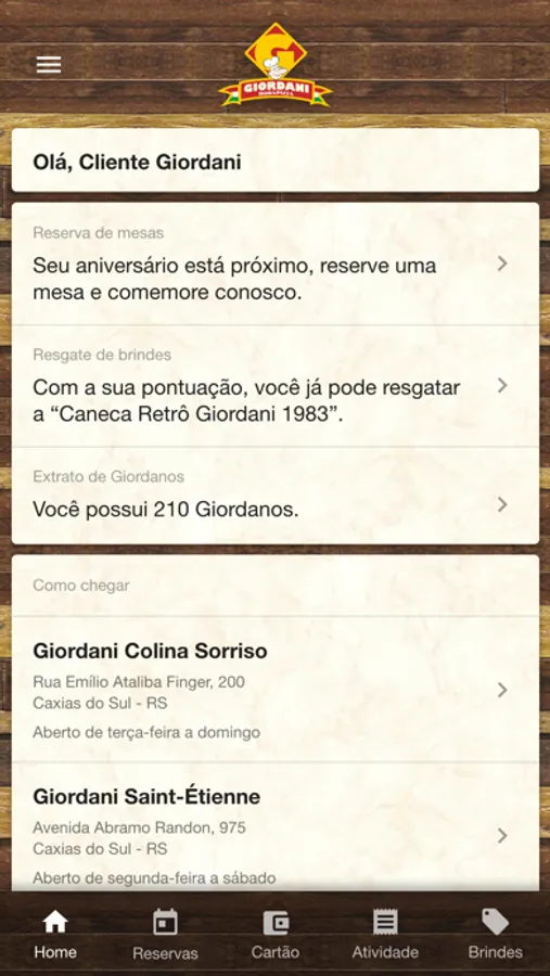 No app, você pode reservar mesas rapidamente, conferir seu extrato de Giordanos (pontos promocionais da Giordani) e trocá-los por brindes exclusivos.