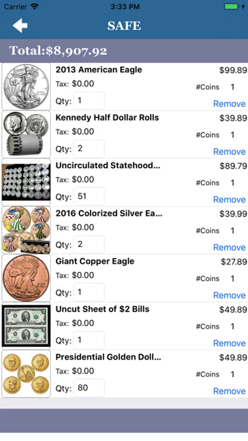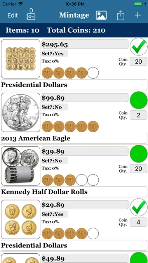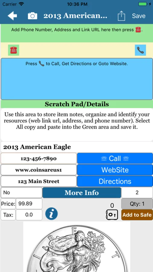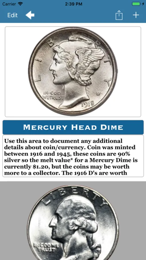 Quickly and accurately store your coin collection information with this app. Calculate monetary values for purchases or sales. No Ads. Grade your coins with a five level scale. Highly customizable, you may enter any kind of coin, currency, collectables, with any detail information. Add photos from your library or camera. Photos saved in the app can be added to your photo library with a long press gesture. The app has capabilities to make calls and get directions within the app. Checkboxes are savable.