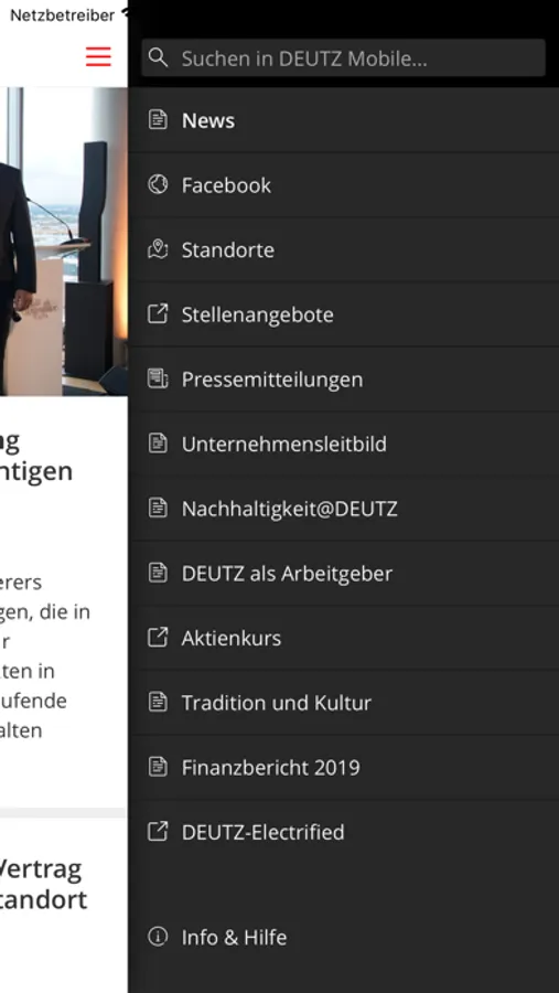 DEUTZ Mobile - für Fans, Freunde und Mitarbeiter der DEUTZ AG. Diese App hält alle auf dem Laufenden. Ob spannende Unternehmensnachrichten oder Informationen zum Unternehmen und Standorten, von nun an ist all das in der App zu finden.