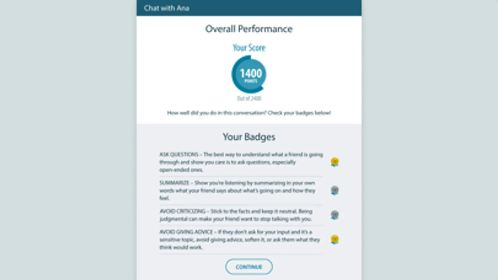 In Friend2Friend, you’ll meet Michael and Ana, teens who have both struggled with stressful situations in their lives. You’ll learn about how overall health includes both your mind and your body. Then you’ll take on the role of Michael and navigate an interactive role-play conversation with “virtual” Ana to help her open up and strategize how to help her connect to a trusted adult. Listening is important, and so is knowing that it’s ok to ask about suicide.
