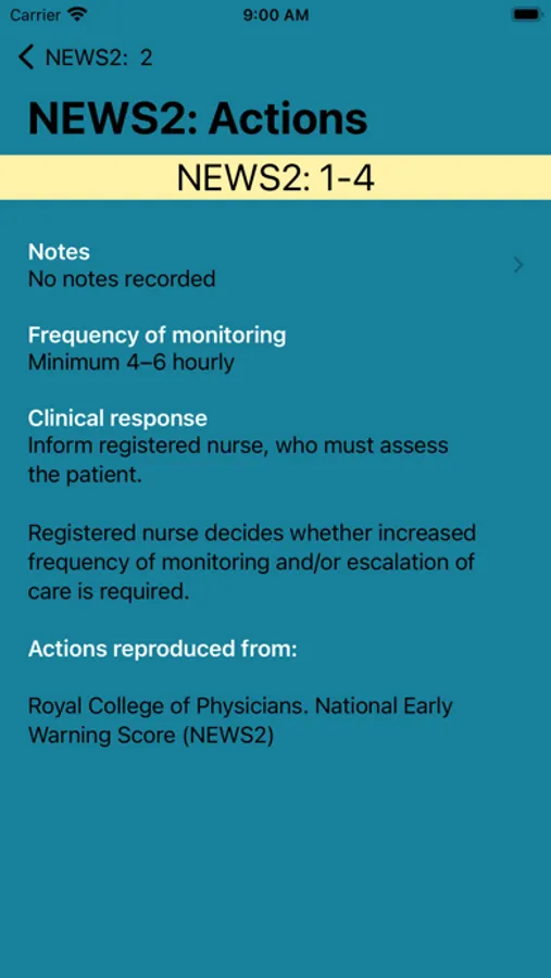 The NEWS score is updated as you input data. Tapping the score takes you to the recommended actions. In addition you can add notes for each score to fit with local policy.