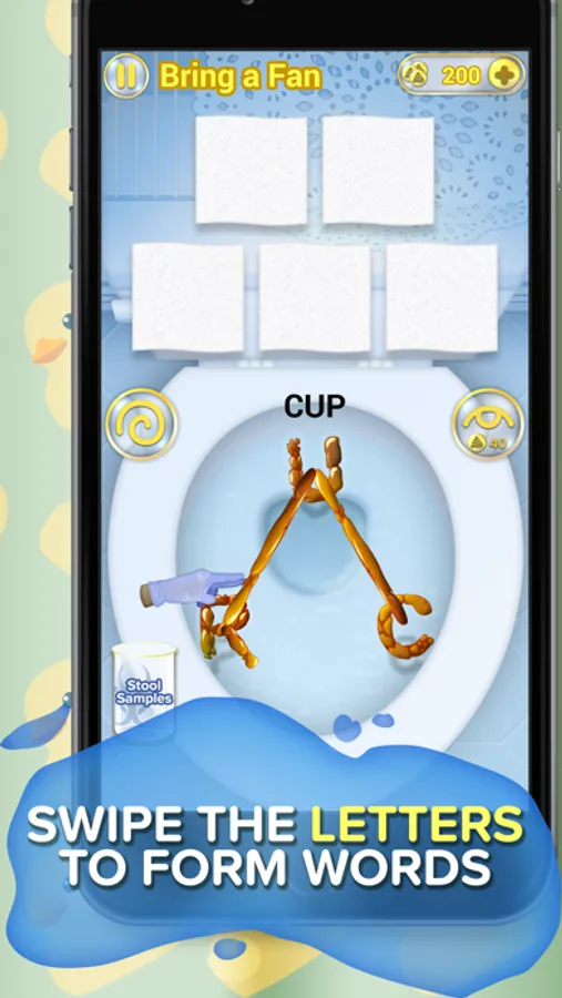 In this word matching game, tap and swipe to connect letters and fill toilet paper squares. Includes hundreds of levels, collectible stool samples, and reward trades.