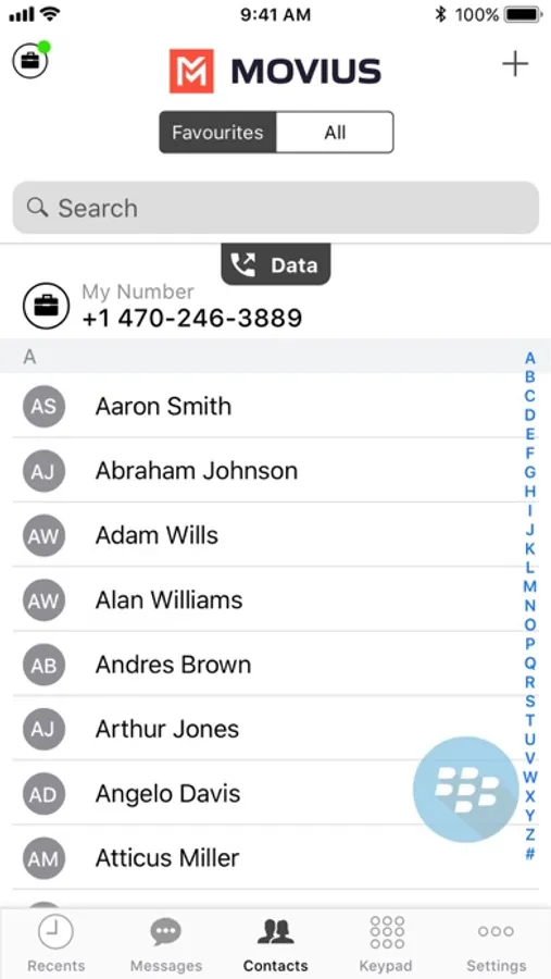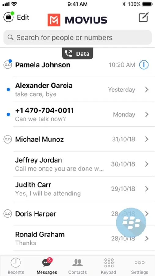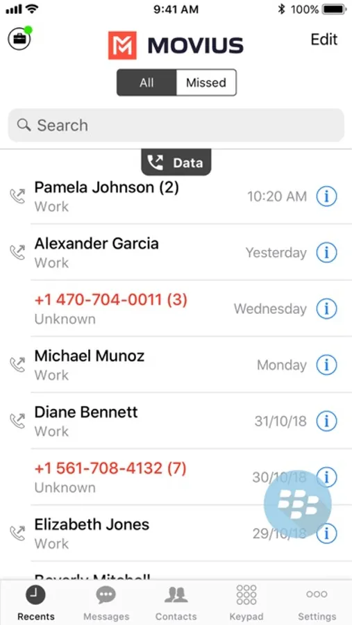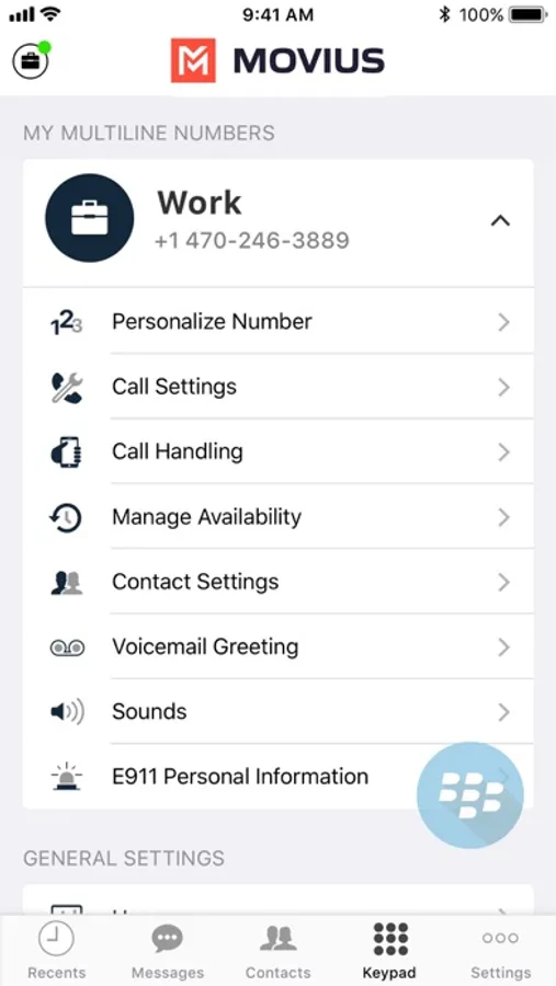 Movius for BlackBerry® is fully integrated with the BlackBerry Dynamics iOS SDK and provides policy control for Enterprise IT Administrators. Movius for BlackBerry allows Click-to-dial and Click-to-message functionality for phone numbers appearing in any BlackBerry Dynamics Container Apps such as BlackBerry Work, BlackBerry Access or other third-party Apps.