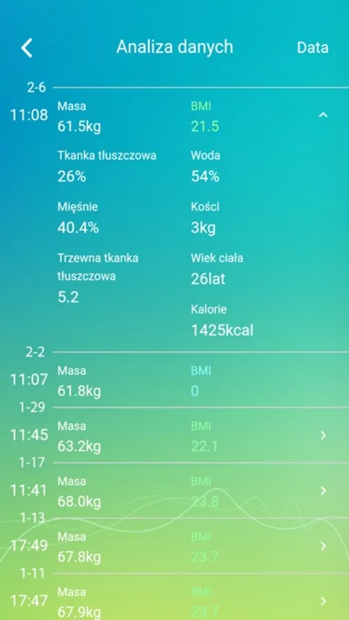 Funkcja analizy danych umożliwia przeglądanie parametrów z każdego pomiaru wraz z datą i godziną.