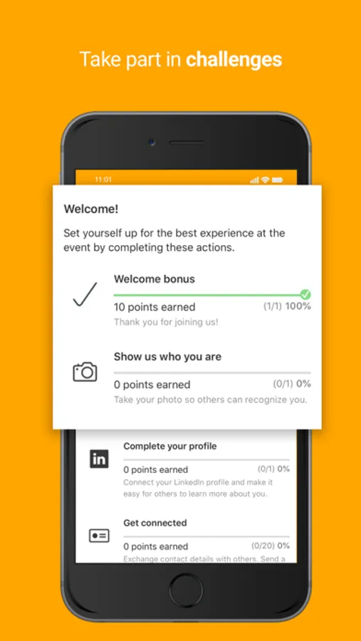 * Interact with other participants exchanging virtual business cards and sending messages.